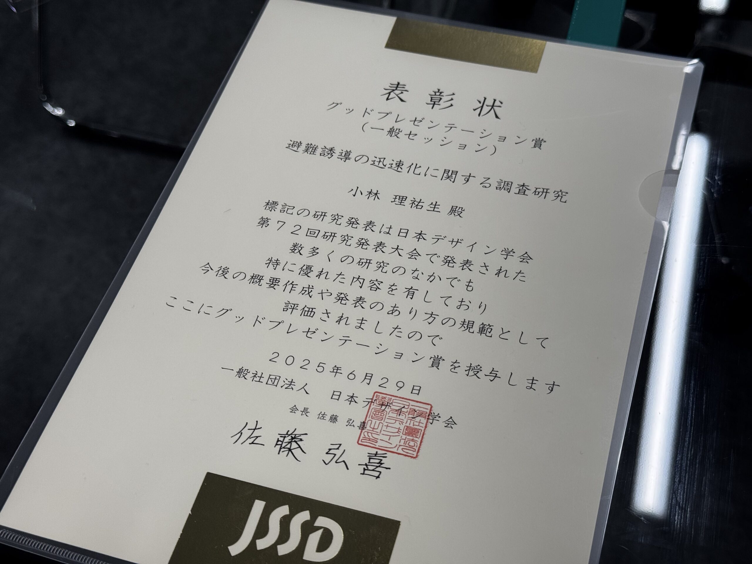 本年6月に札幌で開催された日本デザイン学会春季研究発表大会の口頭発表において、本研究室に所属する修士課程1年生の小林がグッドプレゼンテーション賞を受賞しました。